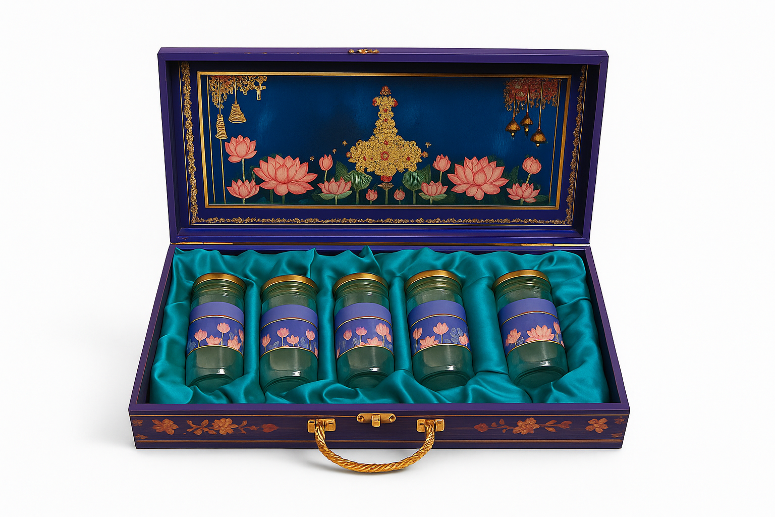 It comes with 5 premium jars (200ml each), nestled in a satin-lined interior—perfect for presenting sweets, dry fruits, chocolates, or festive hampers.