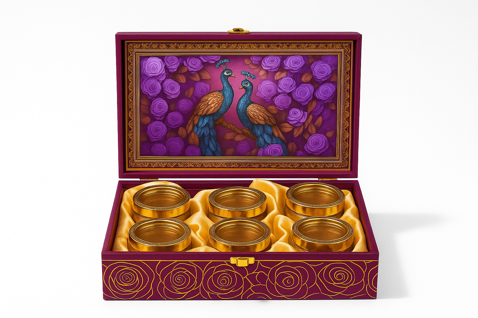 Elevate your celebrations with this exquisitely crafted festive gift box. Adorned with intricate peacock artwork and surrounded by blooming roses, the box reflects elegance, tradition, and opulence. Perfect for gifting during special occasions, it holds delicately designed containers that are ideal for luxury dry fruits, sweets, or precious keepsakes. The rich burgundy tones, golden accents, and artistic detailing make it a stunning centerpiece that adds a touch of sophistication to any festive setting.